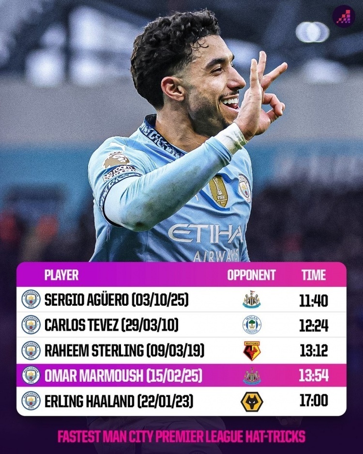 马尔穆什开场33分钟便已矣帽子戏法。曼城一次有球员如斯快地在英超戴帽,仍是2022年对阵狼队的德布劳内。